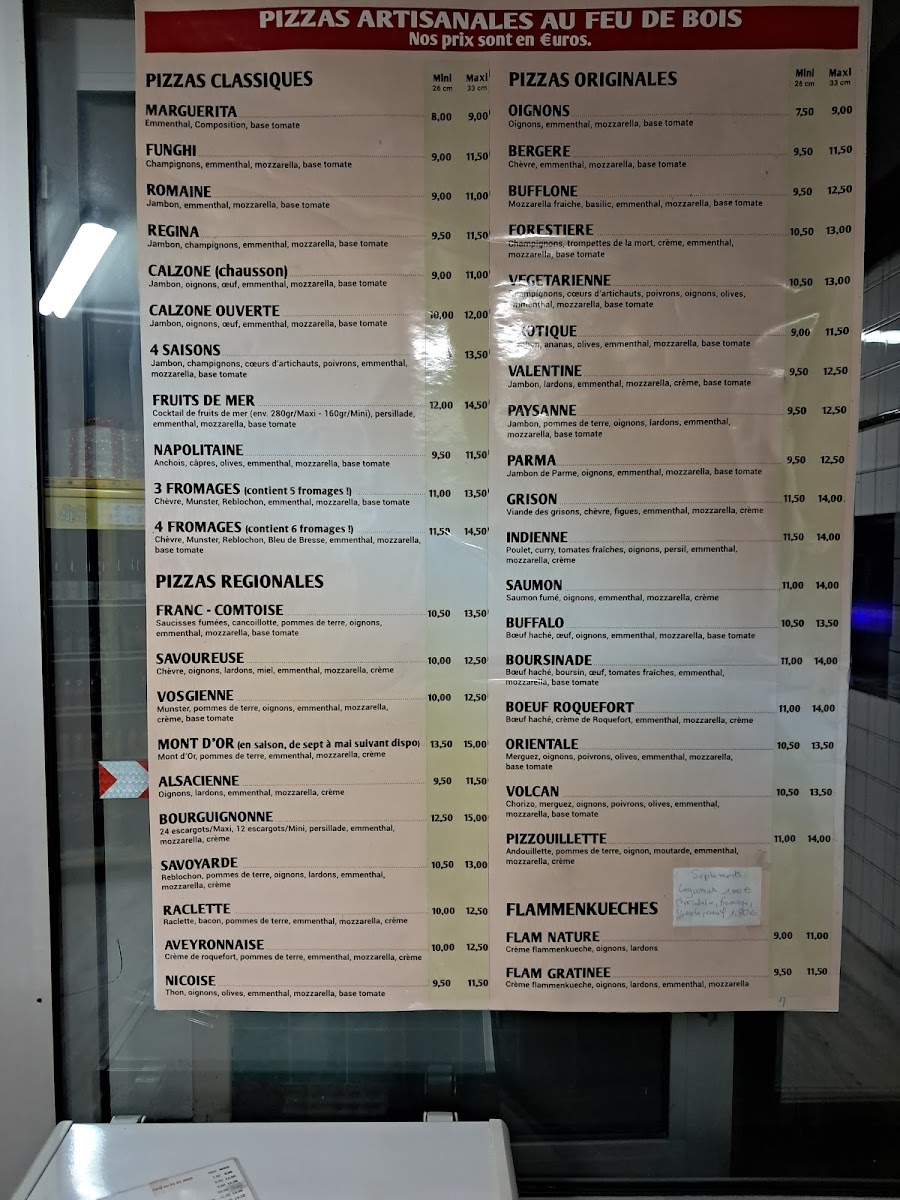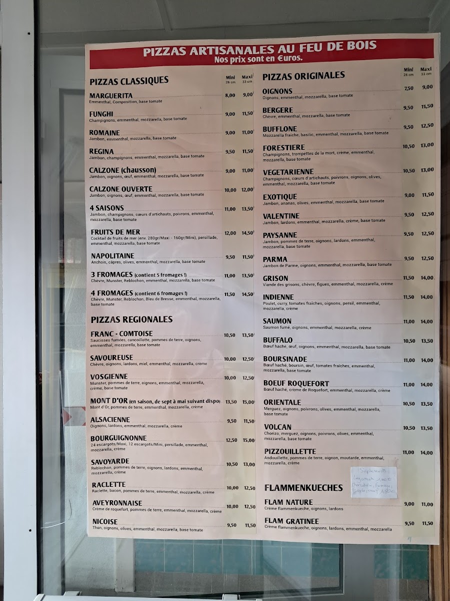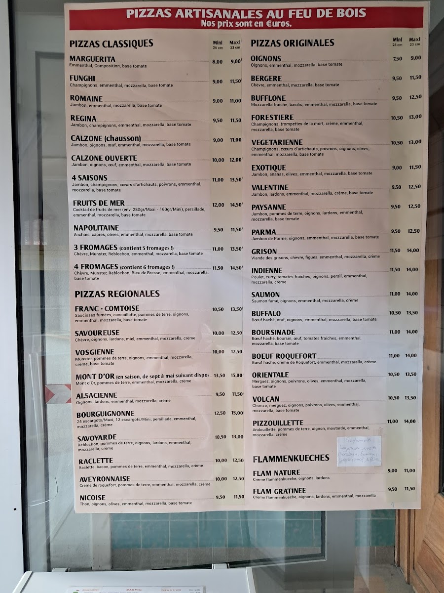 In conclusion, the menu at Maxi Pizza offers a well-rounded selection that highlights both tradition and creativity, making it appealing to a wide range of tastes. The PIZZAS CUITES AU FEU DE BOIS stand out as the centerpiece, with options spanning Pizzas classiques, Pizzas originales, Pizzas régionales, and even more refined choices like Pizzas Saint Jacques, all emphasizing authentic wood-fired flavor. Complementing these are the FLAMMENKUECHES, available as Flam Nature or flam gratinée, which provide a lighter yet equally satisfying alternative. To round off the meal, the DESSERTS section offers simple pleasures such as Glaces and Tiramisu, ensuring a sweet finish. Overall, the menu strikes a balance between variety and simplicity, focusing on recognizable dishes prepared with care rather than overwhelming diners with excessive options.